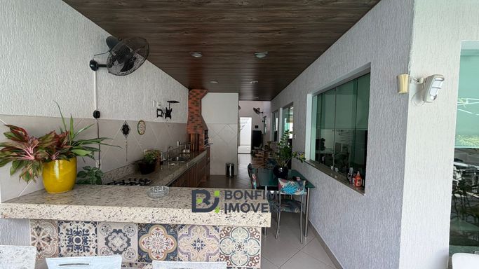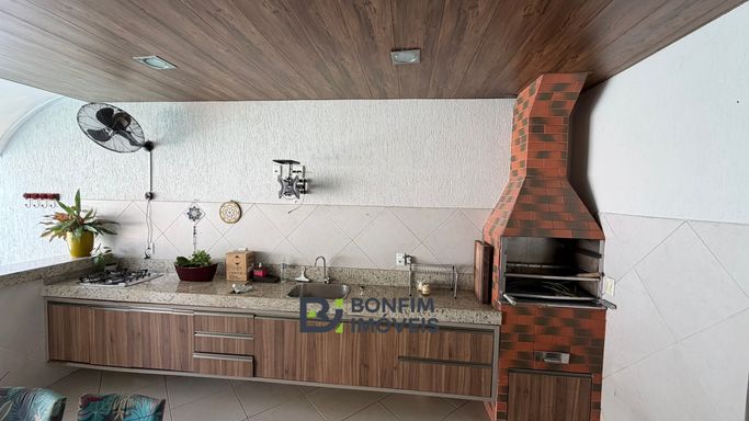 ✅ Espaço gourmet com churrasqueira, bancada com pia e fogão cooktop